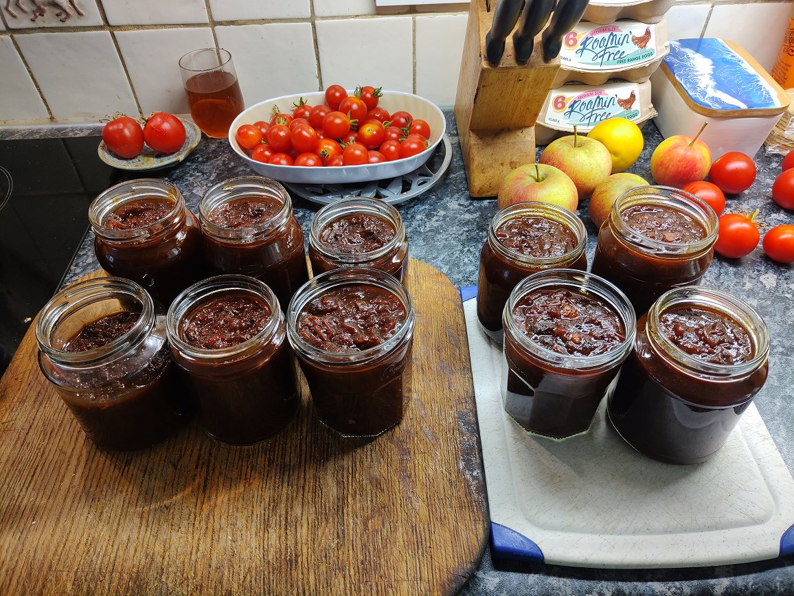 2024 26th October The greenhouse needed clearing and 1.9kgm of red and some green tomatoes were made into chutney to the usual recipe. The apples were Genadier instead of the usual Bramleys. The result was 6 jars of fine looking chutney