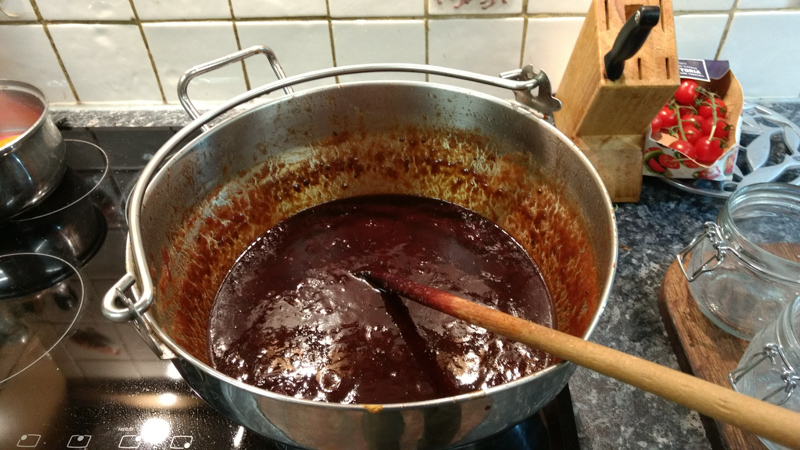Perhaps its Global Warming but we didn't have any green tomatoes this year. However there were far too many cherry tomatoes (Gardeners Delight) in mid season and so a batch of red tomato chutney was made. I'm not sure where the recipe came from, (it looks similar to the green tomato recipe), but it was good.