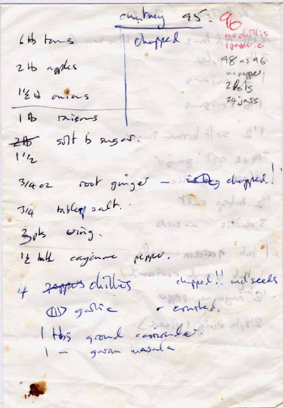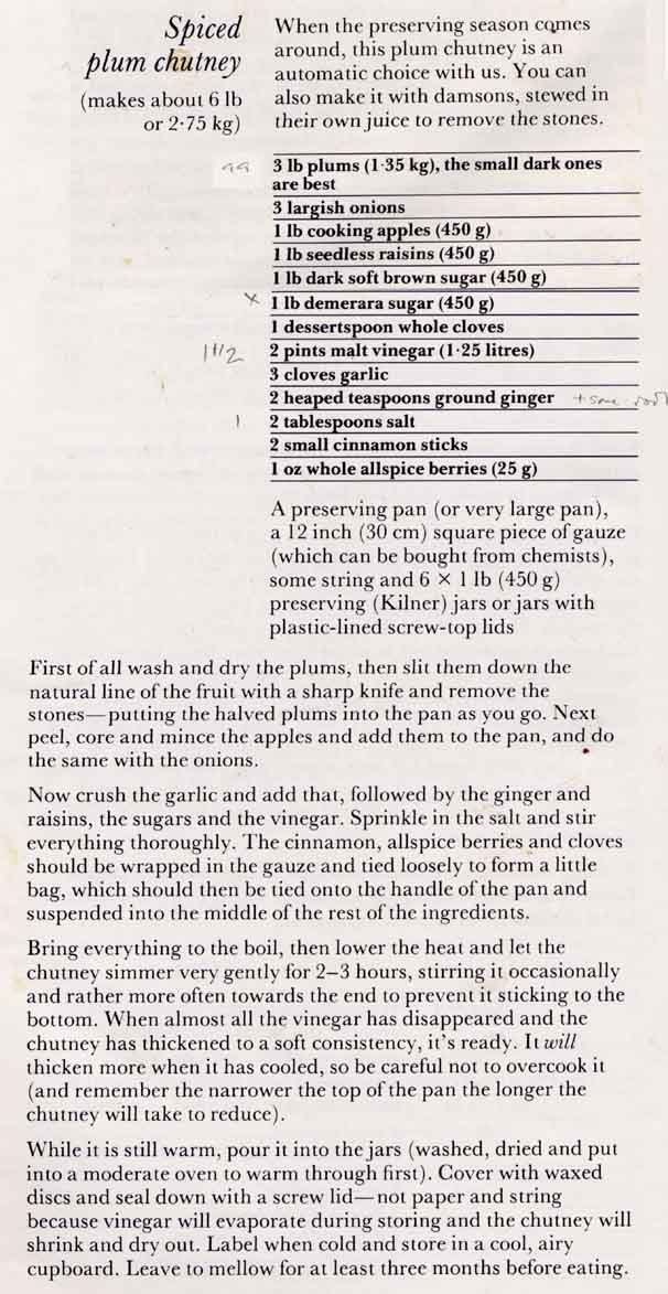 than the recipes suggest. Between 1990 and 1992 Delia's [3] recipe with some variations was used, but a return to the spicier version can be seen in the late 90's. I've put this in the recommended recipes page. After moving to Barton in 1997 we found we had wild plums in the garden. After using them for jam for a couple of years, in 1999 we tried Spiced Plum Chutney, again modified from Delia.[3] This was excellent when quite young (about one year old) but has solidified and lost some of its flavour over the years.