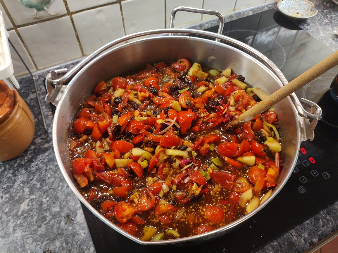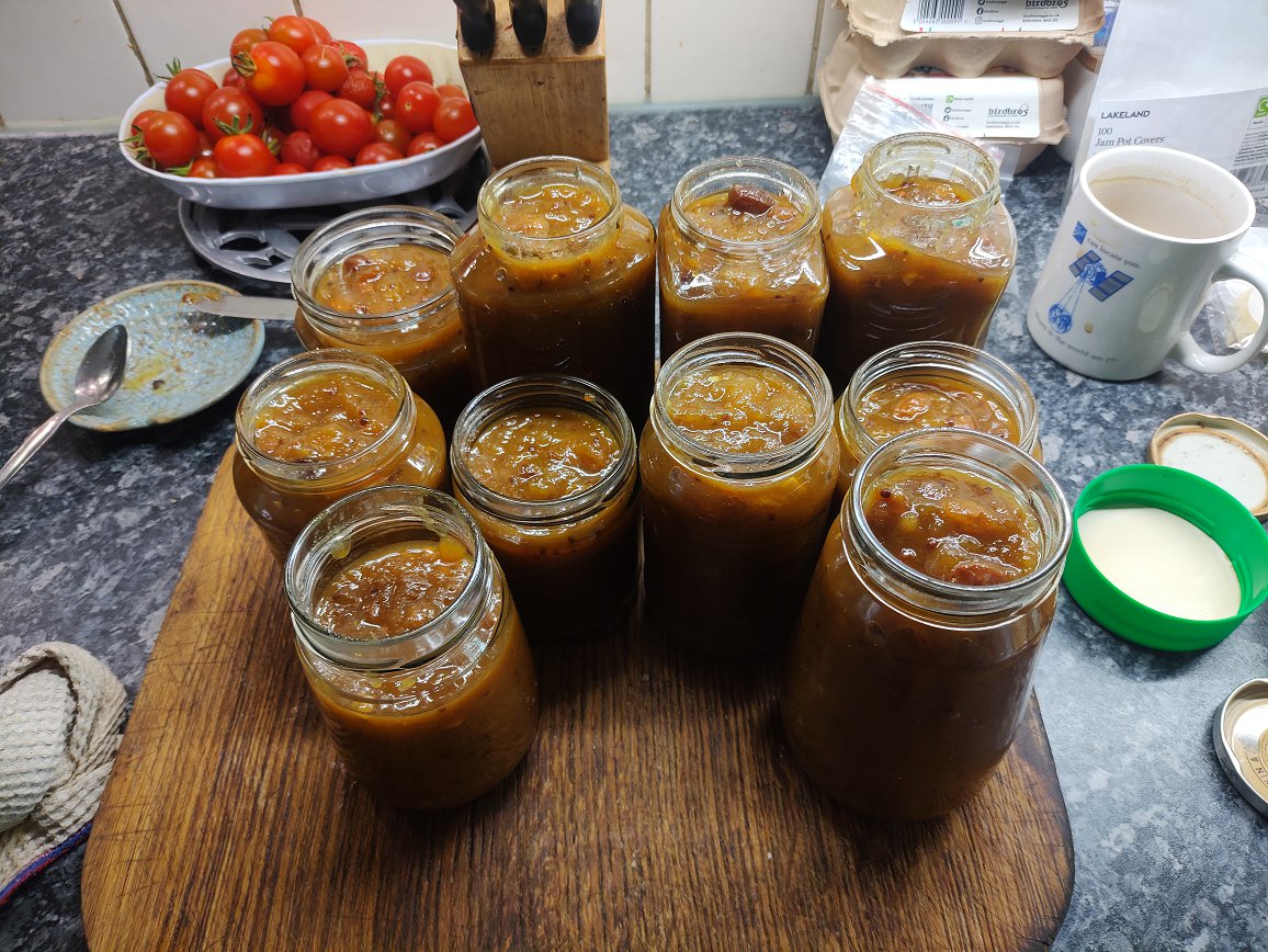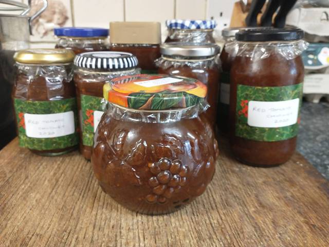 2024 26th October The greenhouse needed clearing and 1.9kgm of red and some green tomatoes were made into chutney to the usual recipe. The apples were Genadier instead of the usual Bramleys. The result was 6 jars of fine looking chutney