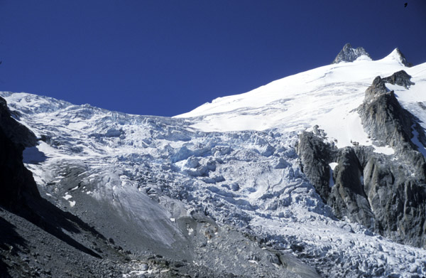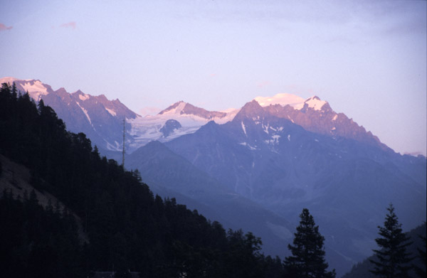 Day 5 Le Peuty to ChampexOff early, had a hard climb up the side of the Trient Glacier to the Fenetre de Arpette. Nearly got blown up by two path repairers setting off explosives! Fantastic views. Crowded on top. Had lunch on a grassy area below the col. Very warm. Boots beginning to hurt my left ankle. Walked down a pleasant valley to a very civilised campsite at Champex. Very welcome shower. Walked down to the town to admire the lakeside and watch the sunset on the Grand Combin. |