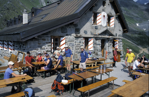 Day 6 Champex to Cabane de MontFortWalked down past the completely still Champex Lake and on down the valley to Sembrancher. Good views across the Rhone valley. Brilliant hot sunny day but my ankle was very sore. Took the Grand St Bernard train and a bus to Verbier. We lounged around in town waiting for the shops to open and then took the cable car and walked along a sunney terrace with superb views of the Grand Combin, to the Cabane de Montfort. This was newly refurbished large hut, more like a hotel, with a gleaming copper roof and showers! Drank beer on the sunny terrace, had a good meal and watched the sun go down. Mt Blanc was just visible on the horizon. |